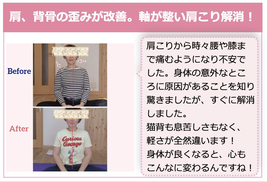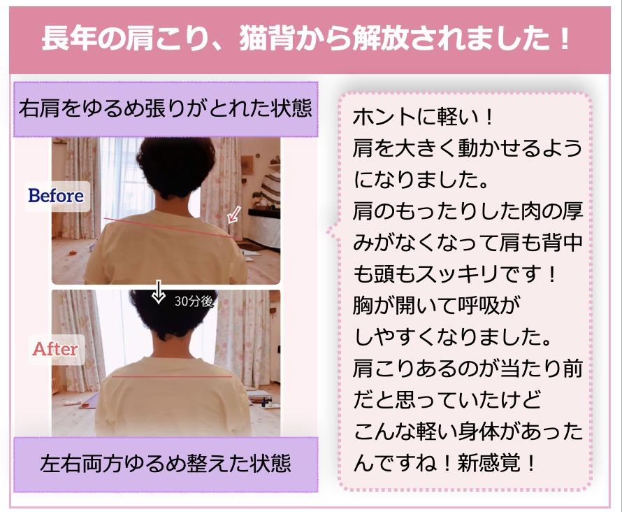 教えてもらったセルフケアは旅行の時にも役立ち、疲れを持ち越さなくなりました。 肩こりは良くなり、調子が良いです!