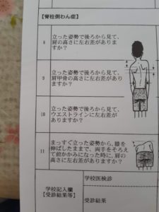 学校の健康診断において四肢の形態及び発育並びに運動器の機能の検査を行っています。運動器検診では、あらかじめ家庭で動作や体を観察し、問診票に記入し提出してください。”